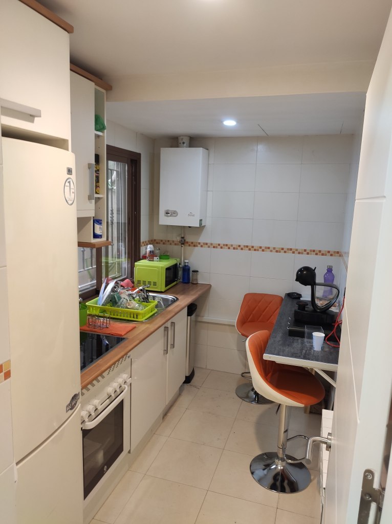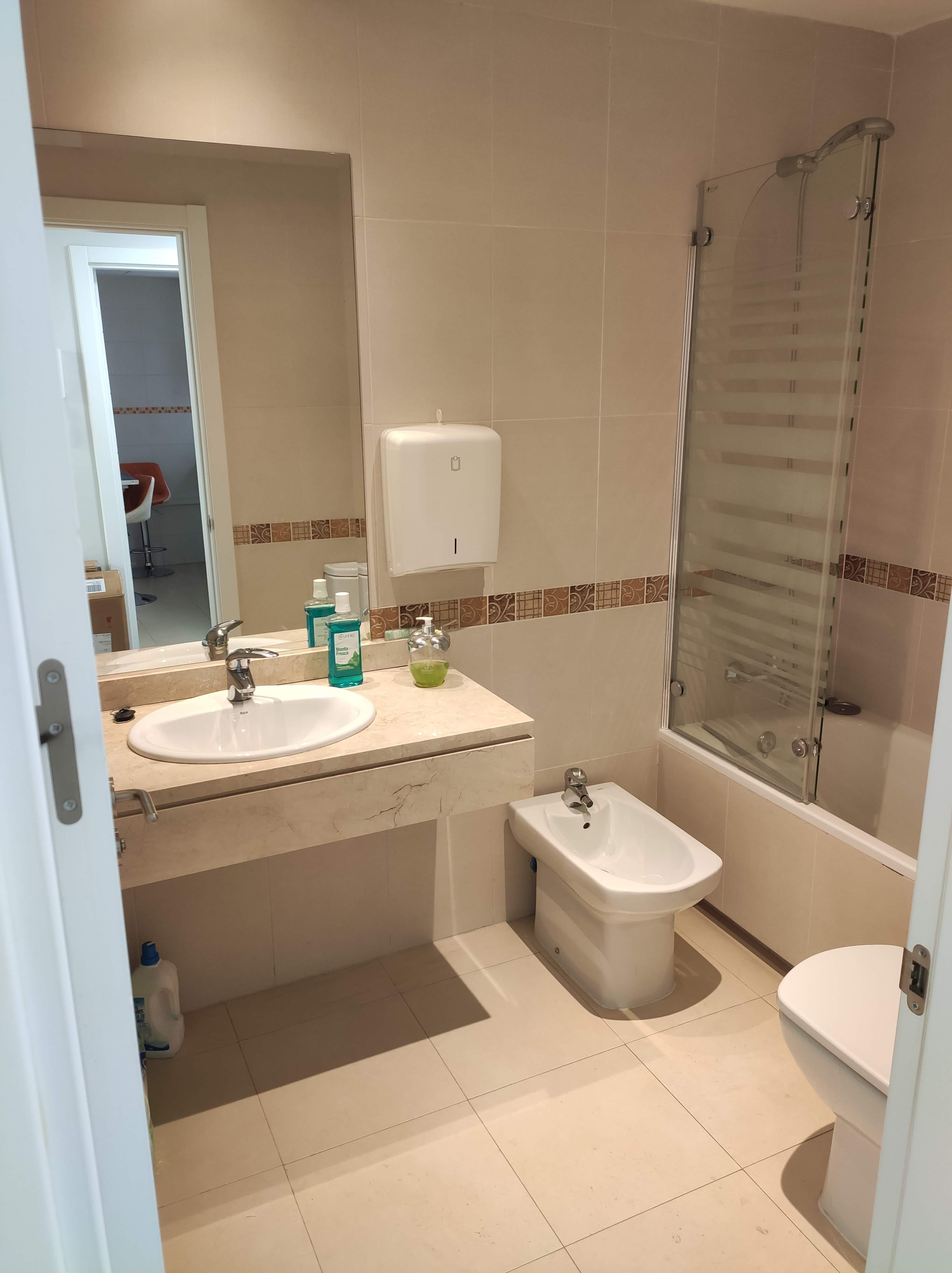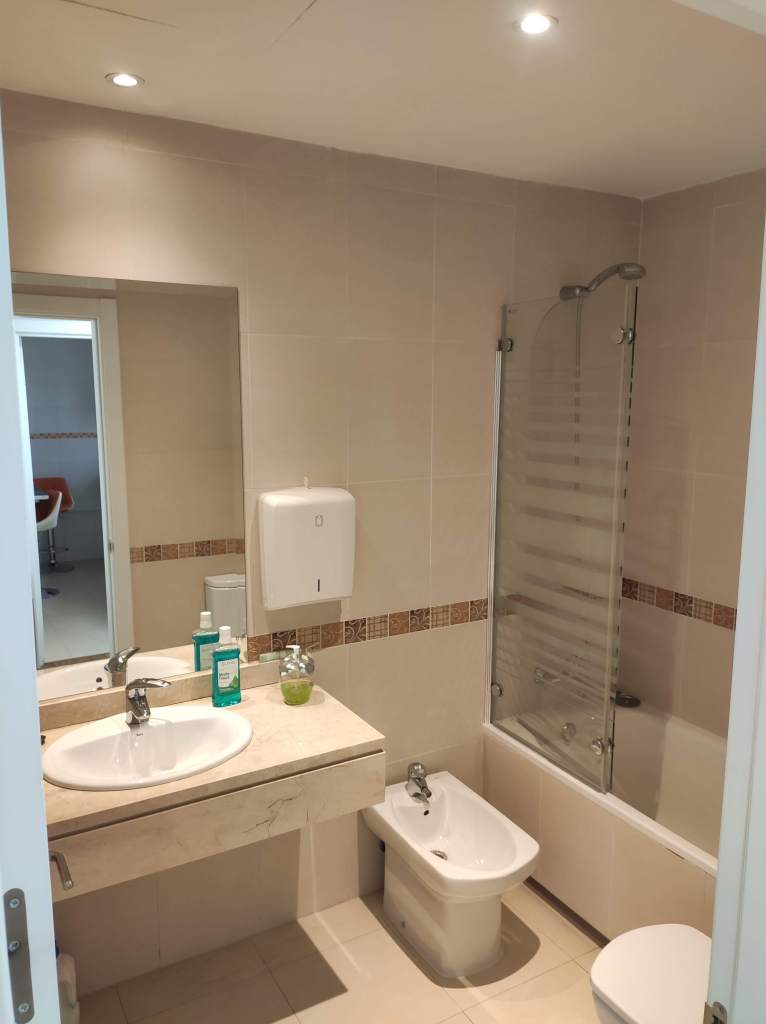 A mano derecha encontramos un baño completo con bañera; de nuestro lado izquierdo tenemos una cocina acogedora y totalmente equipada; a continuación de la cocina se sitúa una amplia sala con paneles de cristal.